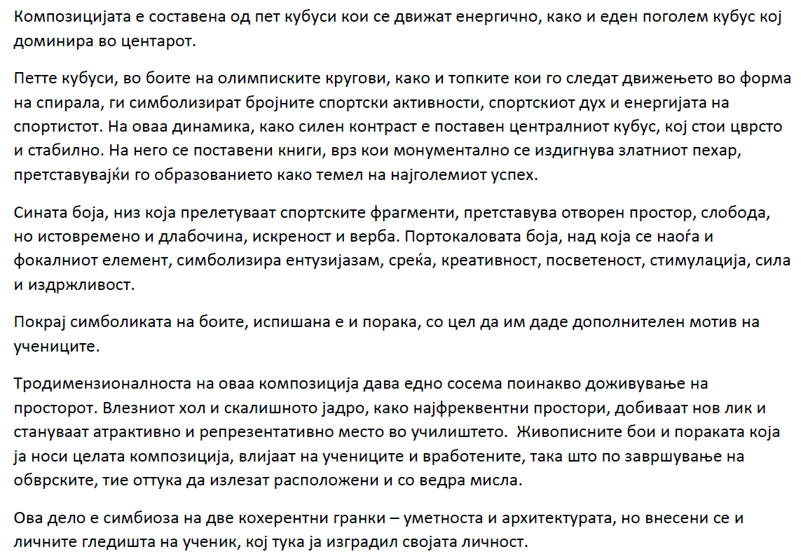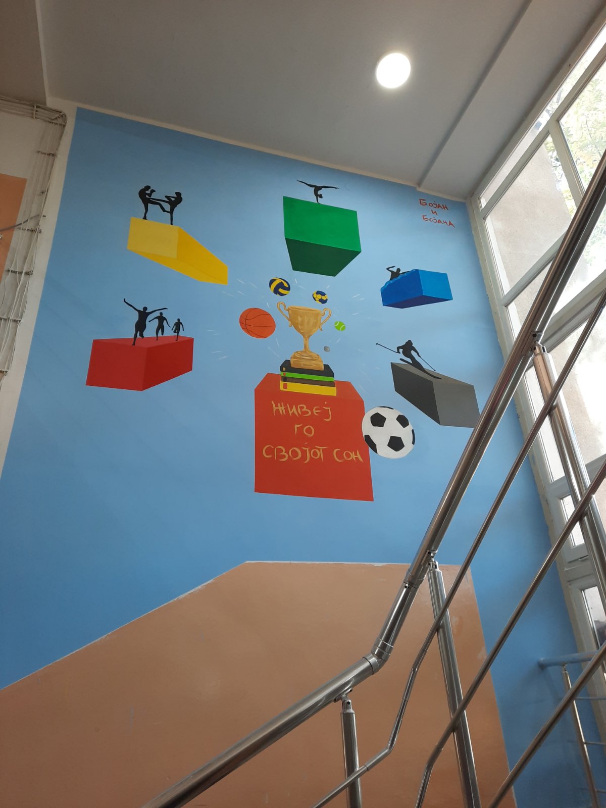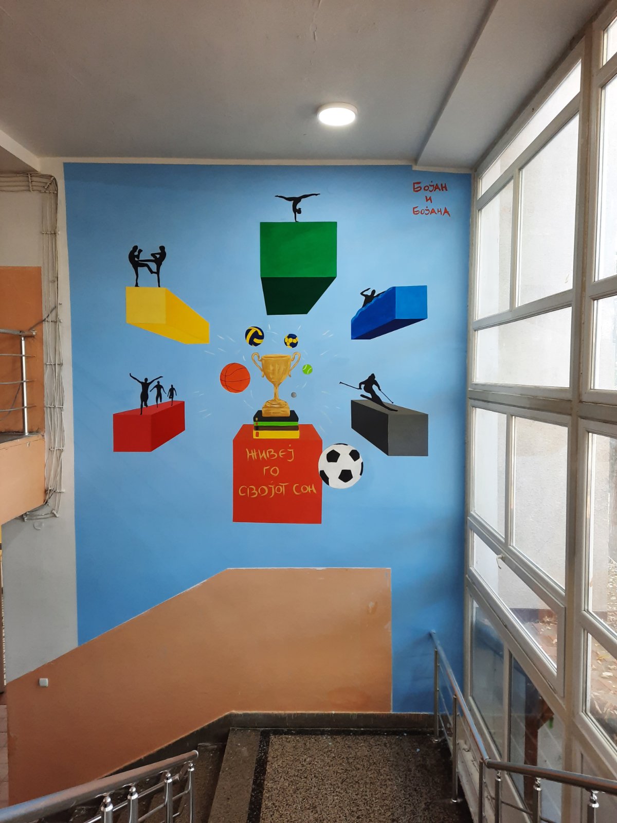 2020-10-20 00:20:26Иднината е светлина кон која одиме низ животот, а факелот со кој ја осветлуваме е во нас, во нашето знаење, култура, воспитување, креативност како и во нашето образование. Главната мисија, визија и заложба на нашето училиште е во насока на спојување на интелектуалните, моралните , емоционалните и творечките потенцијали кај една личност со неговиот правилен психофизички развој, а истата таа личност да даде најголем можен придонес за себе и за другите. Пример за една таква личност, а воедно и гордост на ова училиште е нашата поранешна ученичка Бојана Станковска, сегашен студент на Архитектонскиот факултет, која заедно со ликовниот уметник Бојан Стојкоски беа носители на еден креативен настан во нашето училиште –“ Изработка на мурал во централниот дел на училиштетo,, кој претставува симбиоза на две кохерентни гранки- уметноста и архитектурата, а во себе ги има внесено и личните гледишта на еден ученик кој во ова училиште ја има изградено својата личност. Успехот на проектот и неговата брза реализација не би бил возможен без вас двајца, а ова ваше дело секогаш ќе буди восхит и мотивација за нас и за нашите идни ученици. Од името на сите вработени и ученици во училиштето ви упатуваме најголема благодарност и ви посакуваме иднина во која ќе ги достигнете сите успеси и во која ќе продолжите да чекорите кон патот кој веќе самите го имате трасирано.
