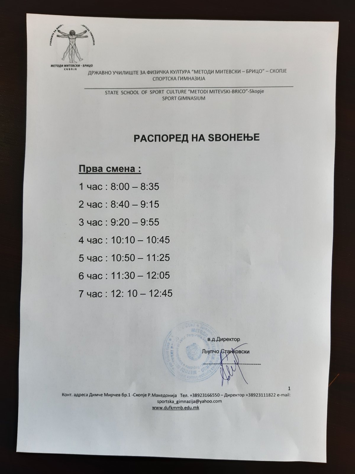 2020-11-20 15:34:53Од понеделник, 23.11.2020 година, наставата ќе се одвива во прва смена со следниот распоред на ѕвонење: